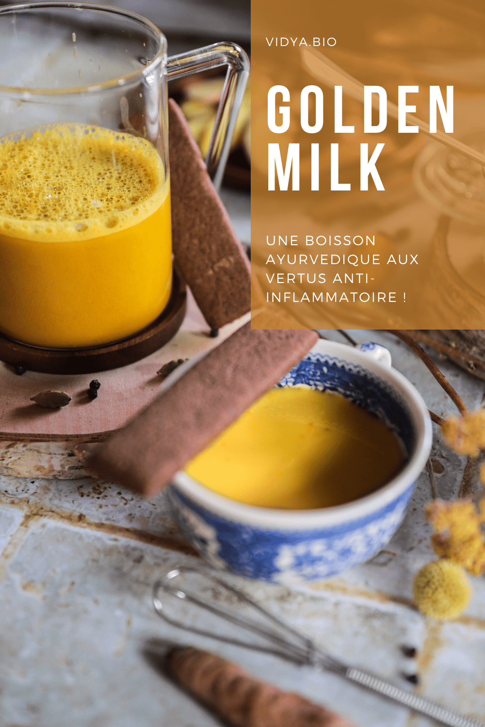 Ou bien tu peux le préparer toi-même avec du curcuma, du gingembre, de la cannelle, de la cardamome et du poivre noir ! Tu peux retrouver la recette complète sur la réalisation du Lait d’Or et ses bienfaits sur le blog.