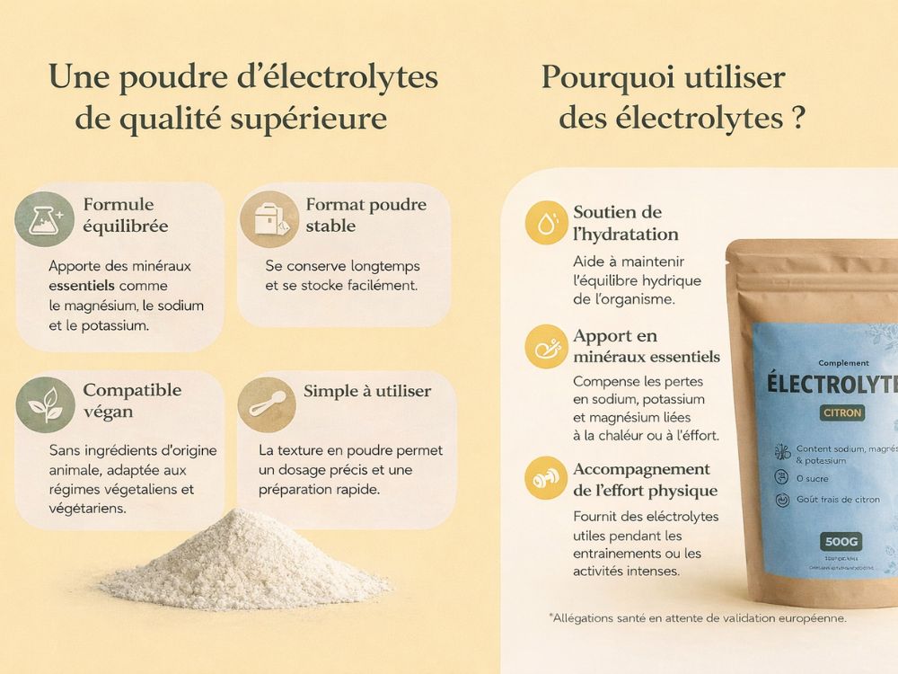 Une bonne hydratation ne dépend pas uniquement de l’eau. Les électrolytes jouent un rôle clé dans l’équilibre hydrique de l’organisme, notamment lors d’une activité physique, en période de chaleur ou lorsque l’alimentation est plus pauvre en minéraux.